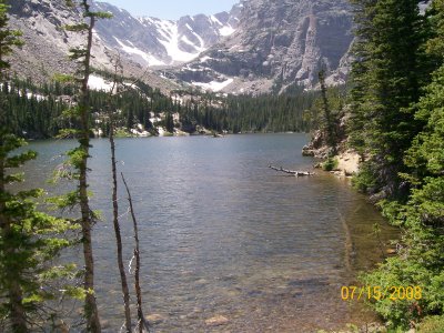 We reached The Loch after two hours of hiking, taking pictures, and with our 25lb daughter on my back in a Kelty Kids backpack. From trailhead to The Loch is three miles and a rise in elevation of 940 feet. At The Loch, there were several scenic spots to sit and eat. Our picnic view can be seen in the picture below. In the upper-center part of this picture is the location of Timberline Falls, Lake of Glass, and Sky Pond. We did not continue to these destinations because they are rated “strenuous” and other hikers coming down from them thought it would be too difficult with a child on my back.