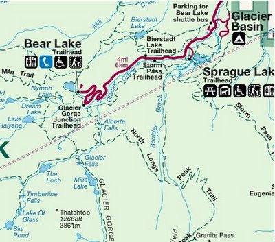 Glacier Gorge Junction is located inside Rocky Mountain National Park and is approximately 20 minutes outside of Estes Park, Colorado. Primary activities include hiking and backpacking but dogs are not allowed inside the park. It has a very small parking lot so I recommend parking at the “Parking for Bear Lake shuttle bus” because the shuttle runs often (i.e., on ten to fifteen minute loops) and if you do not find a parking spot at the trailhead (i.e., like us) then it will cost you at least 30 minutes to drive back to the shuttle bus parking lot. The trailhead has restrooms and water(?). Cell phone service is weak at best.