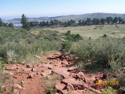The Shoreline Trail (#6 in the trail map) is the most difficult trail on this loop because it requires climbing up a ridge that has a few challenging points. In addition, the ride down the ridge towards Horsetooth Reservoir contains a long stretch of large rocks clustered together (see the following picture). The Shoreline Trail is a branch off of the South Valley Loop Trail so it does not need to be ridden in order to complete the full loop. Specifically, this trail is not recommended for fully rigid mountain bikes. On the other hand, this trail is only an 1,800 feet extension of the South Valley Loop Trail so a failed attempt will not incur a significant loss in time.