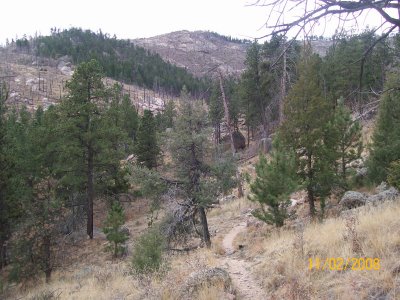 This trail features Ponderosa Pine and Doulgas Firs. They are usually seen together on north-facing slopes like the one in the background of the following picture because they thrive in cool, moist habitats along moderate to steep rocky slopes.