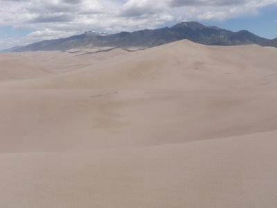 We stopped just short of the high dune but high enough to enjoy a view of the Sangre De Cristo Mountains to the east and south. The following picture faces south and looks back towards the park entrance and sand dunes parking lot.