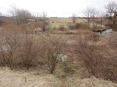 It looks like the paved trail connects to the network of grass trails but we could not find a suitable place to cross the stream because it appeared to be running higher than normal.