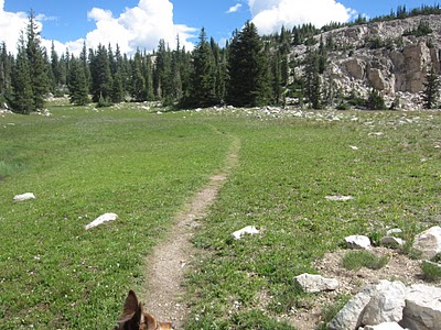 After Kamas Lake, the trail continues to slope up and then levels off through another meadow.
