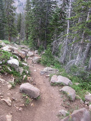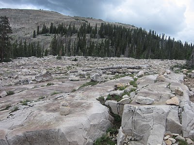 However, after we completed the steep descent from Lofty Lake, our fear of the storm had us moving too quickly. The trail was a little less distinct and I saw a tree off to the left that was marked with a pink ribbon and subsequent cairns denoting a trail. We chose to follow the cairns (i.e., an incorrect left turn) that lead us all the way to Ruth Lake; which by the way is huge mistake. Check out the Google Map above to see how much shorter the hike would have been had we correctly followed the trail to Scout Lake. The following picture includes a segment of trail that we tracked using cairns and that connects Lofty Lake to Ruth lake.