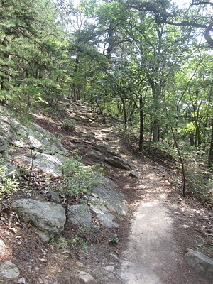 The trail follows the top of a ridge and rolls up and down gradually. There are several wood walkways that mask rocky terrain.