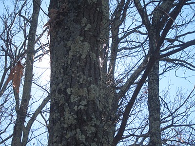 The next picture shows a tree with a double white blaze trail marker, which indicates an obscure turn, route change, or incoming side trail. There are several of these on this hike so be sure to keep a look out for them.
