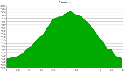 Moose Tracks is a 2.2 mile roundtrip snowshoeing trail with an elevation gain of 400 feet, from 7,500 to 7,900. It can be completed in about an hour and, thus, it is an ideal excursion for people busy with work and/or conference activities. The following elevation chart illustrates the trail’s consistent slope.