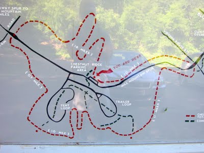 I did not complete the designed 5.4 loop because my detour included an additional six miles. Instead, I cut through the Roanoke Mountain Campground, crossed the street at the campground entrance, and picked up the trail leaving about a half mile of hiking to the Chestnut Ridge Overlook parking area.