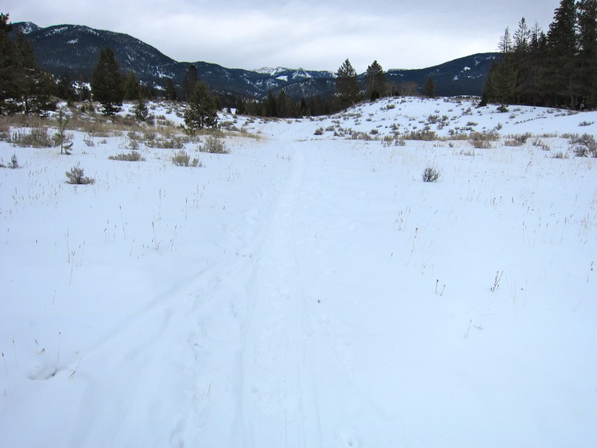 The Google Map above shows the path we hiked in snowshoes and which includes the most popular loop plus an offshoot along First Creek. We hiked counter-clockwise six miles with an elevation gain of 400 hundred feet, from 6,100 to 6,500 feet. We had a difficult time determining when to make a left turn to head back to the parking lot and, thus, the offshoot represents unnecessary hiking. Afterwards, we studied a map at Grizzly Outfitters and determined that there are two loops that can be hiked. The offshoot represents us starting the larger, outer loop known as the Grizzly Loop for mountain biking. We turned around before completing it because the snow was fresh with no footprints to follow and the steeper grade was fatiguing us. I recommend hiking the shorter, inner loop because it should be easily identified by tracks created by others. The inner loop should be around five miles long with an elevation gain of 300 feet.